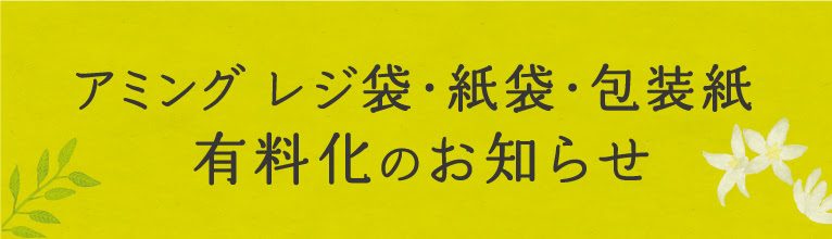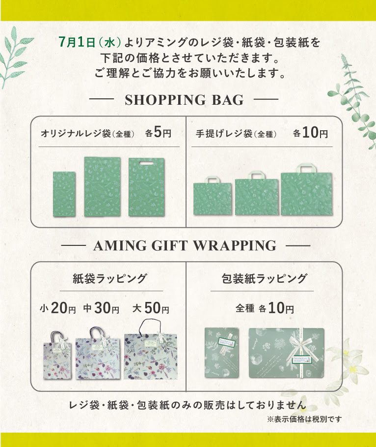 アミングは環境負荷を考えてレジ袋・紙袋・包装紙を有料化することにいたしました。