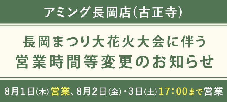 【アミング長岡店(古正寺)】長岡まつり大花火大会に伴う営業時間等変更のお知らせ
