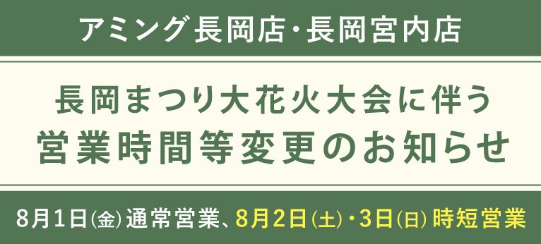 いつもアミングをご利用いただき、ありがとうございます。「長岡まつり大花火大会」による交通機関に関わる影響に伴い、誠に勝手ではございますが、長岡店・長岡宮内店の営業時間を変更させていただきます。